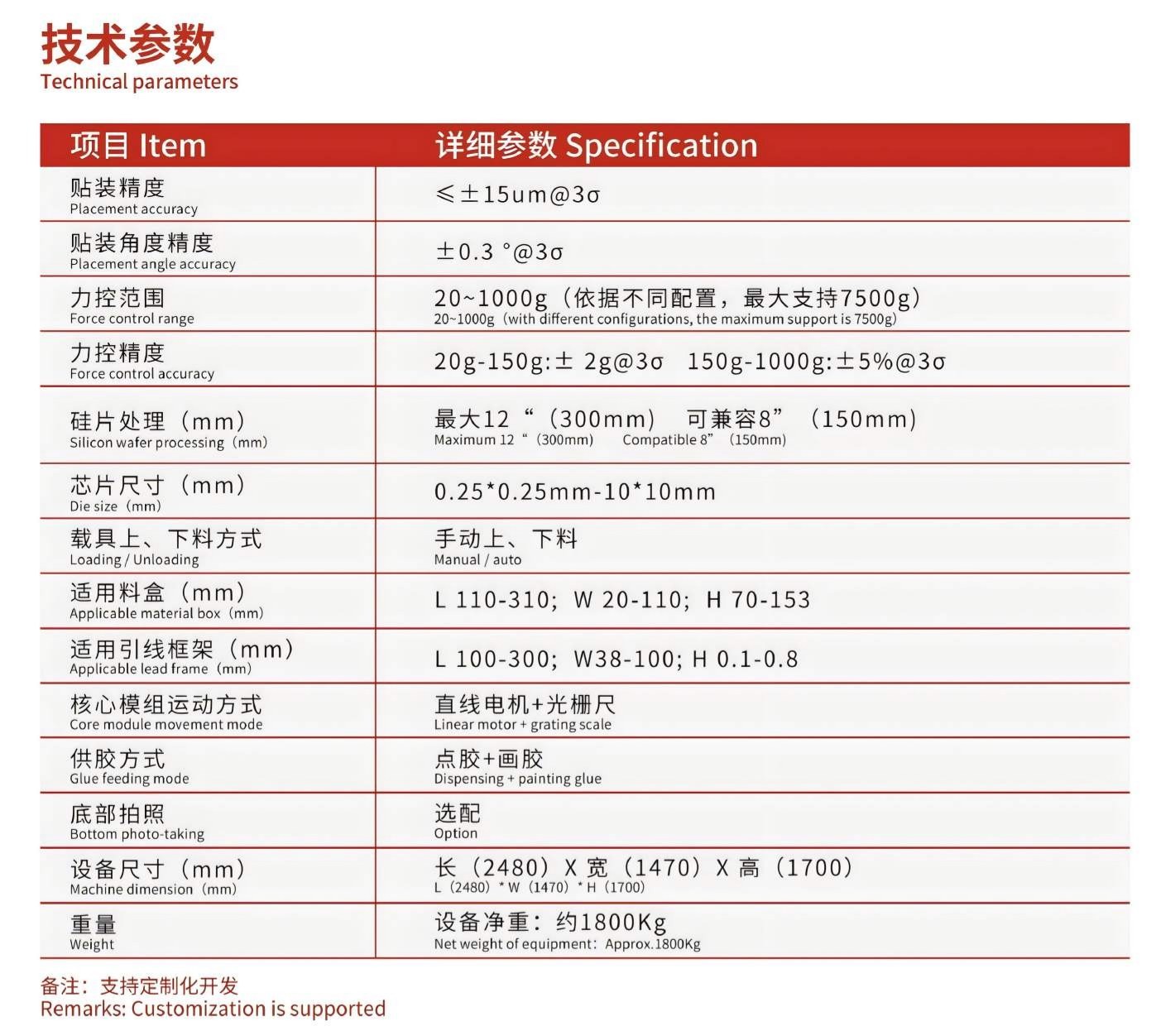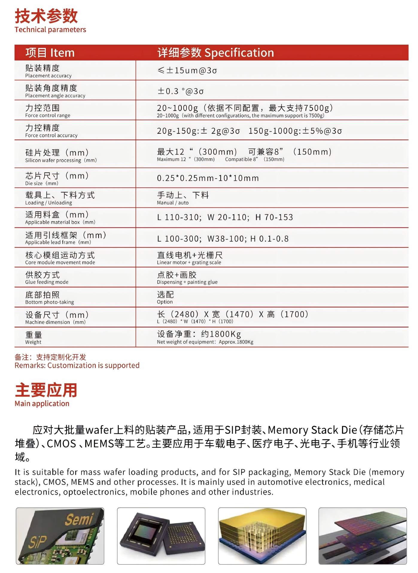 通用型高精度芯片貼合機,應對大批量wafer上料的貼裝產品,適用于SIP封裝、Memory Stack Die(存儲芯片堆疊)、CMOS 、MEMS等工藝。