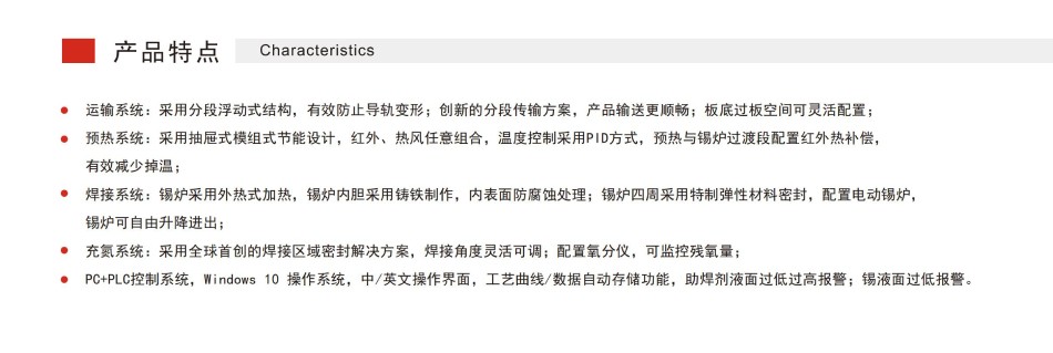 PC+PLC控制系統(tǒng):Windows10操作系統(tǒng),中/英文操作界面,工藝曲線/數(shù)據(jù)自動(dòng)存儲(chǔ)功能,助焊劑液面過低過高報(bào)警;錫液面過低報(bào)警。